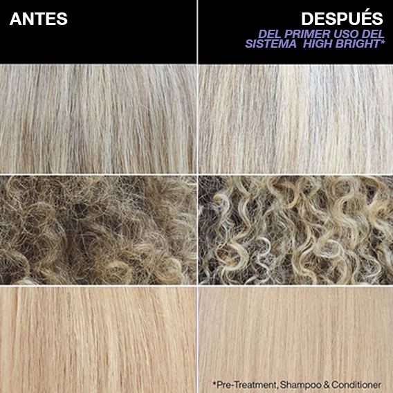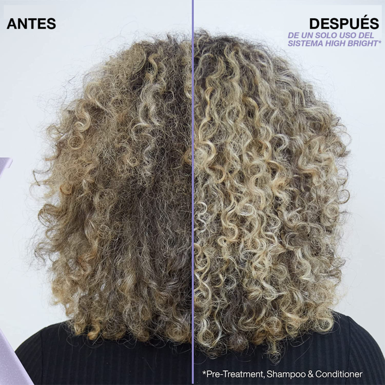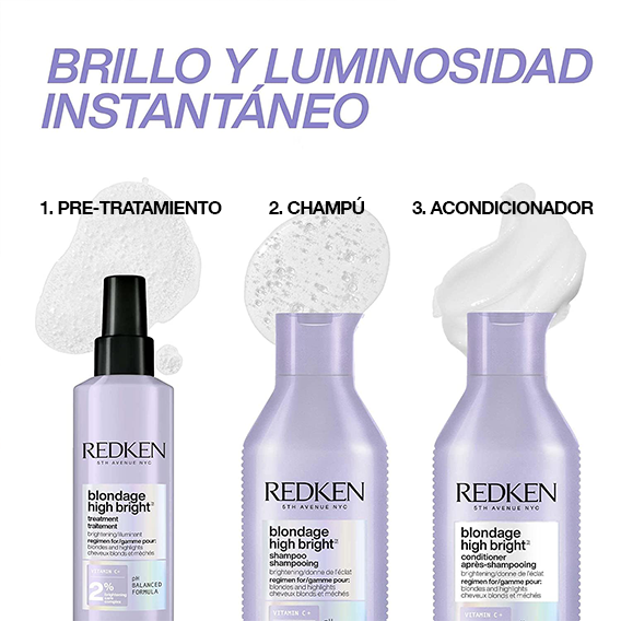 La rutina completa incluye un pre-tratamiento, champú y acondicionador. El 92% de los estilistas que lo han puesto a prueba comprueban que se luce un rubio más brillante después de un solo uso. 🙌🏼 Blondage High Bright™ está potenciado por vitamina C+ y nuestro complejo de cuidado iluminador, un dúo formulado con agentes quelantes para ayudar a lograr resultados instantáneos. Produciendo un cabello rubio más brillante y con la cutícula sellada para bloquear los factores externos que lo opacan con solo UN uso.