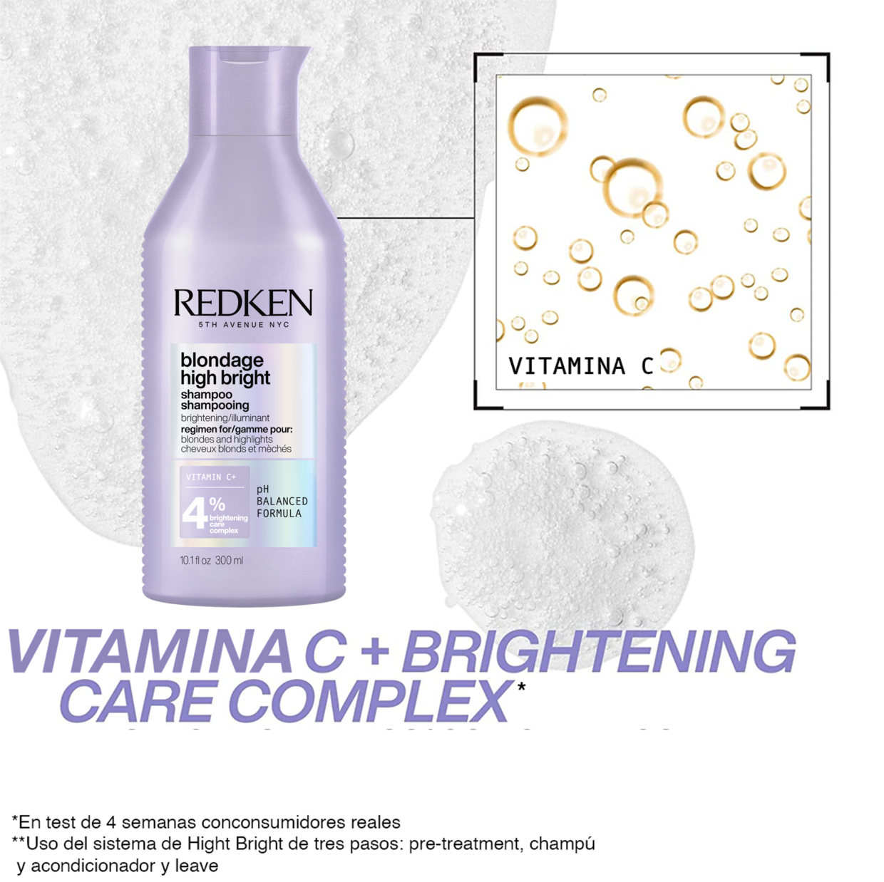 El nuevo sistema Blondage High Bright™ es nuestra respuesta a los rubios que pierden luminosidad y se opacan entre visitas al salón. El sistema funciona eliminando la acumulación y las impurezas del cabello opaco y sin brillo debido a los agentes externos y la contaminación. Formulado con vitamina C y nuestro Brightening Care Complex, este nuevo régimen ilumina y aclara el cabello sin peróxido. Cuando se usa como un sistema completo, Blondage High Bright™ te ayudará a lucir un cabello rubio instantáneamente más brillante en un solo uso.