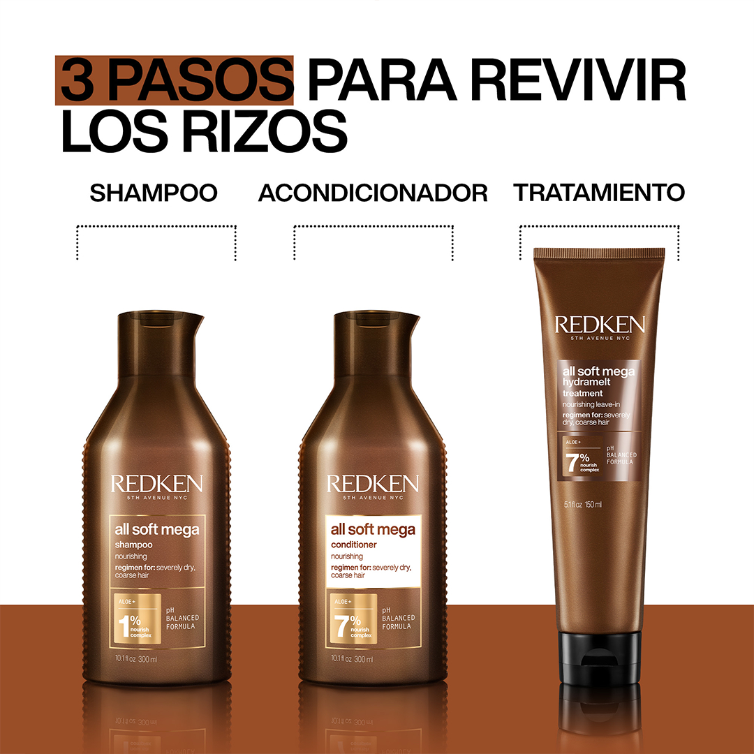 - El NUEVO champú All Soft Mega Curls cuenta con el exclusivo Nourish Complex y Aloe Vera de Redken, para hidratar, fortalecer y retener la humedad y la suavidad durante todo el día. Este champú sin sulfatos limpia suavemente mientras proporciona una nutrición intensa y suavidad desde el primer uso