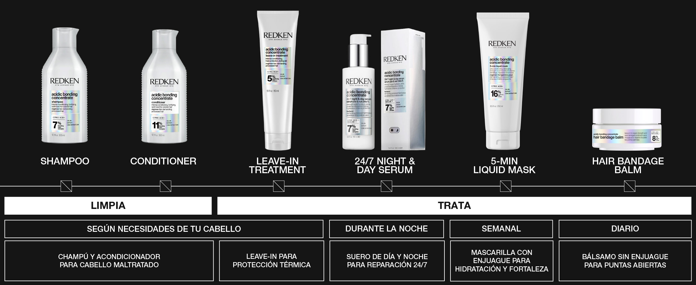 - Acidic Bonding Concentrate Leave-In Treatment para combatir el daño visible y protección térmica hasta 450°F.